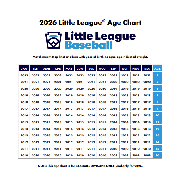 For example, if your Little League baseball player was born on 10/25/2015, he is "league age 10" for the Spring 2026 season.